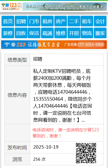 私人定制KTV招聘吧员,底薪2400加200满勤,每个月两天带薪休息,每天两顿饭,应聘电话14704644446,15355550464,微信同步个人14704644446 【电话咨询时,请一定说明在七台河信息网看到的,谢谢!】 |