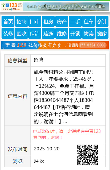 凯全新材料公司招聘车间男工人,年龄要求,25-45岁,上12休24。免费工作餐。月薪4300满三个月交五险!电话18304644487个人18304644487 【电话咨询时,请一定说明在七台河信息网看到的,谢谢!】 |