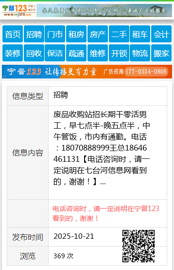 废品收购站招长期干零活男工,早七点半-晚五点半,中午管饭,市内有通勤。电话:18070888999王总18646461131 【电话咨询时,请一定说明在七台河信息网看到的,谢谢!】 |