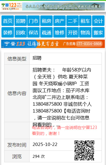 招聘更夫: 年龄58岁以内(全天班) 供吃 夏天种菜园 冬天烧取暖小锅炉 工资面议工作地点:茄子河水库 北岗矿二井边上联系电话:13804875800 非诚勿扰个人13804875800 【电话咨询时,请一定说明在七台河信息网看到的,谢谢!】 |