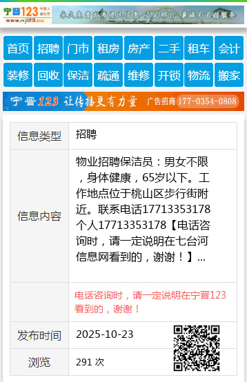 物业招聘保洁员:男女不限,身体健康,65岁以下。工作地点位于桃山区步行街附近。联系电话17713353178个人17713353178 【电话咨询时,请一定说明在七台河信息网看到的,谢谢!】 |