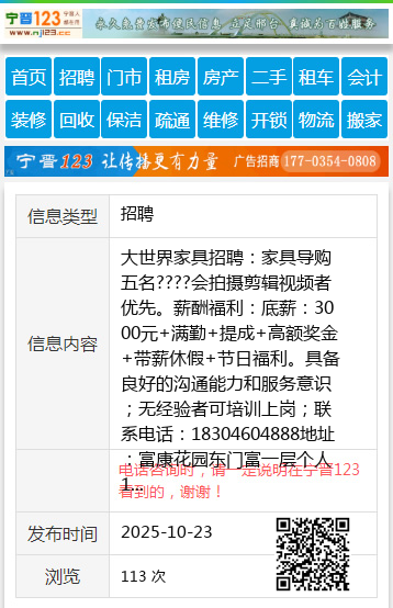 大世界家具招聘:家具导购五名????会拍摄剪辑视频者优先。薪酬福利:底薪:3000元+满勤+提成+高额奖金+带薪休假+节日福利。具备良好的沟通能力和服务意识;无经验者可培训上岗;联系电话:18304604888地址:富康花园东门富一层个人18304604888 【电话咨询时,请一定说明在七台河信息网看到的,谢谢!】 |