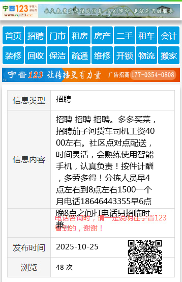招聘 招聘 招聘。多多买菜,招聘茄子河货车司机工资4000左右。社区点对点配送,时间灵活,会熟练使用智能手机,认真负责!按件计酬,多劳多得!分拣人员早4点左右到8点左右1500一个月电话18646443355早6点晚8点之间打电话另招临时兼职人员,拉多少算多少!个人18646443355 【电话咨询时,请一定说明在七台河信息网看到的,谢谢!】 |