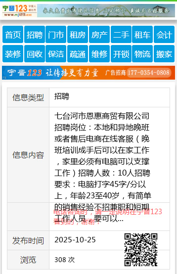 七台河市恩惠商贸有限公司招聘岗位:本地和异地晚班或者售后电商在线客服(晚班培训成手后可以在家工作,家里必须有电脑可以支撑工作)招聘人数:10人招聘要求:电脑打字45字/分以上,年龄23至40岁,有简单的销售经验不招兼职和短期工作人员,要可以长期做的,不要短期工。联系电话 15204647438(微信同步)个人15204647438 【电话咨询时,请一定说明在七台河信息网看到的,谢谢!】 |