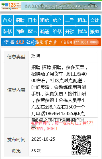 招聘 招聘 招聘。多多买菜,招聘茄子河货车司机工资4000左右。社区点对点配送,时间灵活,会熟练使用智能手机,认真负责!按件计酬,多劳多得!分拣人员早4点左右到8点左右1500一个月电话18646443355早6点晚8点之间打电话另招临时兼职人员,拉多少算多少!个人18646443355 【电话咨询时,请一定说明在七台河信息网看到的,谢谢!】 |
