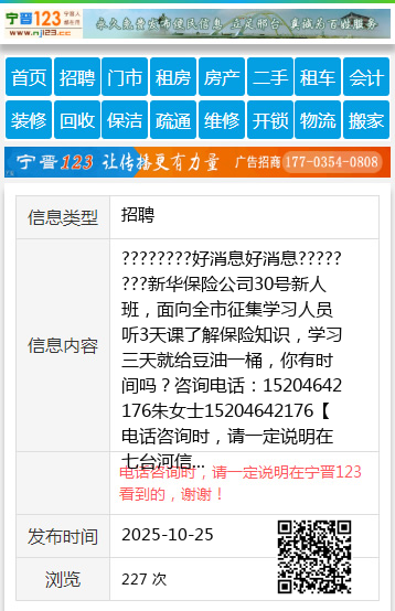 ????????好消息好消息????????新华保险公司30号新人班,面向全市征集学习人员听3天课了解保险知识,学习三天就给豆油一桶,你有时间吗?咨询电话:15204642176朱女士15204642176 【电话咨询时,请一定说明在七台河信息网看到的,谢谢!】 |