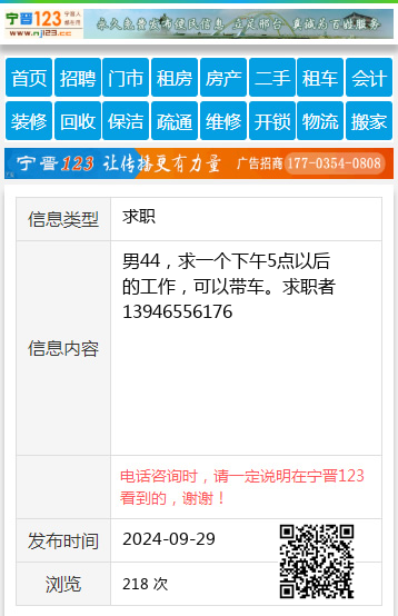 男44,求一个下午5点以后的工作,可以带车。求职者13946556176