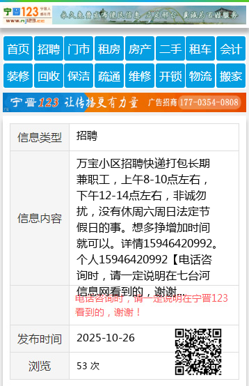 万宝小区招聘快递打包长期兼职工,上午8-10点左右,下午12-14点左右,非诚勿扰,没有休周六周日法定节假日的事。想多挣增加时间就可以。详情15946420992。个人15946420992 【电话咨询时,请一定说明在七台河信息网看到的,谢谢!】 |