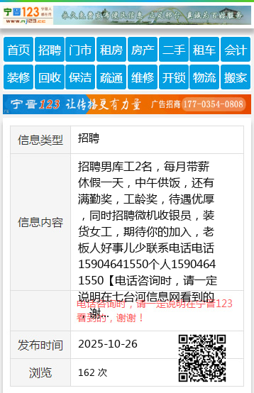 招聘男库工2名,每月带薪休假一天,中午供饭,还有满勤奖,工龄奖,待遇优厚,同时招聘微机收银员,装货女工,期待你的加入,老板人好事儿少联系电话电话15904641550个人15904641550 【电话咨询时,请一定说明在七台河信息网看到的,谢谢!】 |