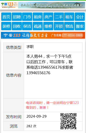 本人男44,求一个下午5点以后的工作,可以带车,联系电话13946556176求职者13946556176