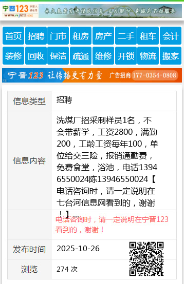 洗煤厂招采制样员1名,不会带薪学,工资2800,满勤200,工龄工资每年100,单位给交三险,报销通勤费,免费食堂,浴池,电话13946550024陈13946550024 【电话咨询时,请一定说明在七台河信息网看到的,谢谢!】 |
