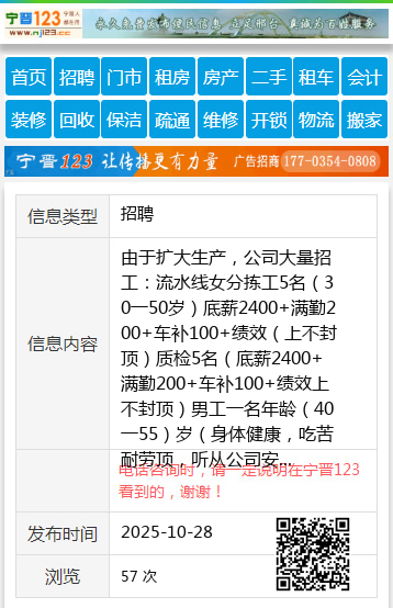 由于扩大生产,公司大量招工:流水线女分拣工5名(30一50岁)底薪2400+满勤200+车补100+绩效(上不封顶)质检5名(底薪2400+满勤200+车补100+绩效上不封顶)男工一名年龄(40一55)岁(身体健康,吃苦耐劳顶,听从公司安排)底薪3000+满勤+车补+工作表现奖上料工一名(年龄不限)2100+满勤+车补+工作表现奖叠衣工若干名(招小时工,年龄不限,机件工资,周结)公司员工都有晋升厂长,车间主任机会,只要你有能力,利丰公司永远给你机会!选择利丰,让你富贵一生!!试用期3天。额满为止!早7:30一16:30中午管饭!厂址:新兴区宝泰隆路26号。公交路线:坐(走葫芦头沟的)1路公交车到(家居广场)站点前走100米恒阳科技公司红大门院内。☎️13946506087个人13946506087 【电话咨询时,请一定说明在七台河信息网看到的,谢谢!】 |