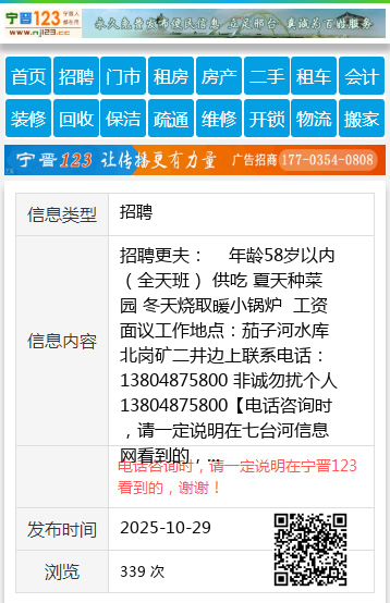招聘更夫: 年龄58岁以内(全天班) 供吃 夏天种菜园 冬天烧取暖小锅炉 工资面议工作地点:茄子河水库 北岗矿二井边上联系电话:13804875800 非诚勿扰个人13804875800 【电话咨询时,请一定说明在七台河信息网看到的,谢谢!】 |