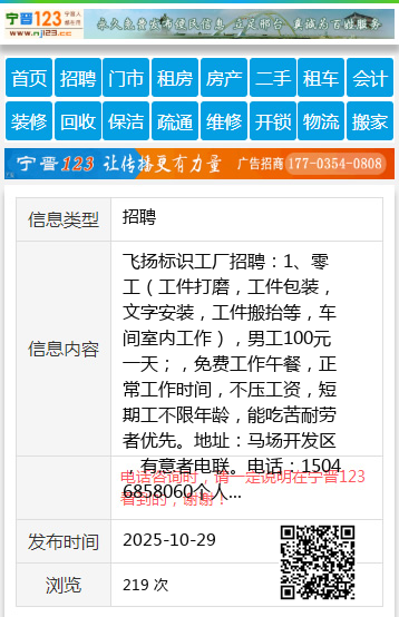 飞扬标识工厂招聘:1、零工(工件打磨,工件包装,文字安装,工件搬抬等,车间室内工作),男工100元一天;,免费工作午餐,正常工作时间,不压工资,短期工不限年龄,能吃苦耐劳者优先。地址:马场开发区,有意者电联。电话:15046858060个人15046858060 【电话咨询时,请一定说明在七台河信息网看到的,谢谢!】 |