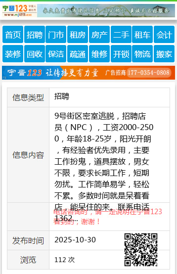 9号街区密室逃脱,招聘店员(NPC),工资2000-2500,年龄18-25岁,阳光开朗,有经验者优先录用,主要工作扮鬼,道具摆放,男女不限,要求长期工作,短期勿扰。工作简单易学,轻松不累。多数时间就是呆着看店,能呆住的来。联系电话13624649187,工作地点,步行街上段世纪电脑城三楼。个人13624649187 【电话咨询时,请一定说明在七台河信息网看到的,谢谢!】 |