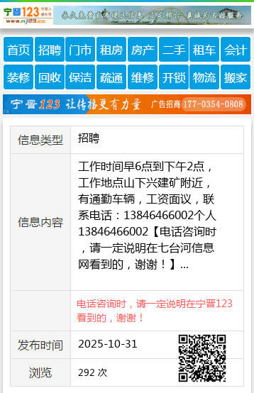 工作时间早6点到下午2点,工作地点山下兴建矿附近,有通勤车辆,工资面议,联系电话:13846466002个人13846466002 【电话咨询时,请一定说明在七台河信息网看到的,谢谢!】 |