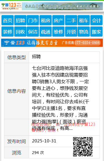 七台河比亚迪路驰海洋店强强入驻本市因建店现需要招聘销售3人男女不限,一定要有上进心,想挣钱发展空间大,有经验优先,公司有培训,有时间让你去成长(干中学)主播1名,要求有直播经验优先,形象好,沟通能力强[抱拳](面谈)薪资待遇有保底,有高额提成,有公休,有食堂老板事少,工资准,招长期稳定,短期工你也赚不到钱就别来了[好的]地址:七台河大明街六闾道口联系电话☎:鲁先生18944646266个人18944646266 【电话咨询时,请一定说明在七台河信息网看到的,谢谢!】 |