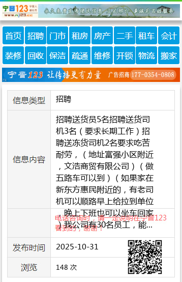 招聘送货员5名招聘送货司机3名(要求长期工作)招聘送冻货司机2名要求吃苦耐劳,(地址富强小区附近,文浩商贸有限公司)(做五路车可以到)(如果家在新东方惠民附近的,有老司机可以顺路早上给拉到单位,晚上下班也可以坐车回家)我公司有30名员工,能长期工作的,欢迎你的加入电话13199231100个人13199231100 【电话咨询时,请一定说明在七台河信息网看到的,谢谢!】 |