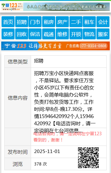 招聘万宝小区快递网点客服,不是驿站。要求家住万宝小区45岁以下有责任心的女性,会简单电脑办公软件,负责打包发货等工作,工作时间:早8点-晚17.30分。详情15946420992个人15946420992 【电话咨询时,请一定说明在七台河信息网看到的,谢谢!】 |