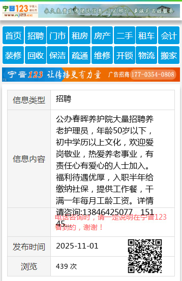公办春晖养护院大量招聘养老护理员,年龄50岁以下,初中学历以上文化,欢迎爱岗敬业,热爱养老事业,有责任心有爱心的人士加入。福利待遇优厚,入职半年给缴纳社保,提供工作餐,干满一年每月工龄工资。详情请咨询:13846425077 15145652774个人13846425077 【电话咨询时,请一定说明在七台河信息网看到的,谢谢!】 |