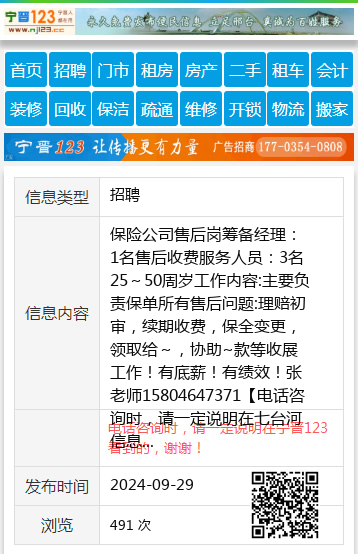 保险公司售后岗筹备经理:1名售后收费服务人员:3名25~50周岁工作内容:主要负责保单所有售后问题:理赔初审,续期收费,保全变更,领取给~,协助~款等收展工作!有底薪!有绩效!张老师15804647371 【电话咨询时,请一定说明在七台河信息网看到的,谢谢!】 |