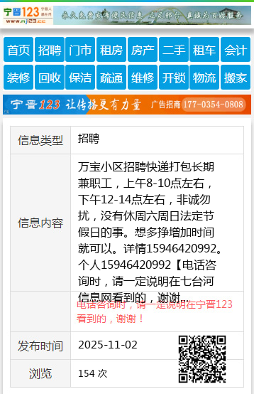 万宝小区招聘快递打包长期兼职工,上午8-10点左右,下午12-14点左右,非诚勿扰,没有休周六周日法定节假日的事。想多挣增加时间就可以。详情15946420992。个人15946420992 【电话咨询时,请一定说明在七台河信息网看到的,谢谢!】 |
