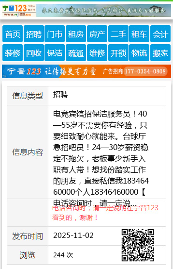电竞宾馆招保洁服务员!40—55岁不需要你有经验,只要细致耐心就能来。台球厅急招吧员!24—30岁薪资稳定不拖欠,老板事少新手入职有人带!想找份踏实工作的朋友,直接私信我18346460000个人18346460000 【电话咨询时,请一定说明在七台河信息网看到的,谢谢!】 |