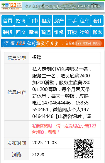 私人定制KTV招聘吧员一名,服务生一名,吧员底薪2400加200满勤,服务生底薪2800加200满勤,每个月两天带薪休息,每天一顿饭,应聘电话14704644446,15355550464,微信同步个人14704644446 【电话咨询时,请一定说明在七台河信息网看到的,谢谢!】 |