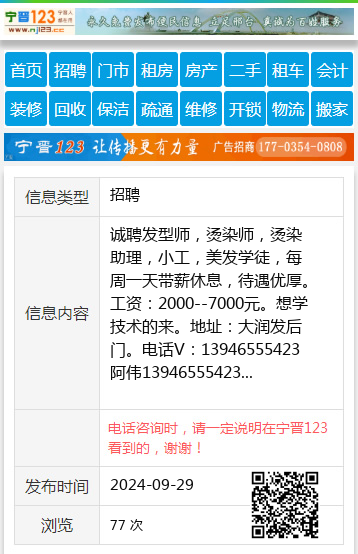 诚聘发型师,烫染师,烫染助理,小工,美发学徒,每周一天带薪休息,待遇优厚。工资:2000--7000元。想学技术的来。地址:大润发后门。电话V:13946555423阿伟13946555423 【电话咨询时,请一定说明在七台河信息网看到的,谢谢!】 |