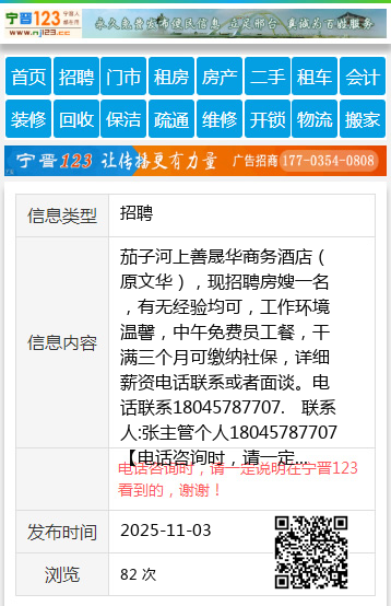 茄子河上善晟华商务酒店(原文华),现招聘房嫂一名,有无经验均可,工作环境温馨,中午免费员工餐,干满三个月可缴纳社保,详细薪资电话联系或者面谈。电话联系18045787707. 联系人:张主管个人18045787707 【电话咨询时,请一定说明在七台河信息网看到的,谢谢!】 |