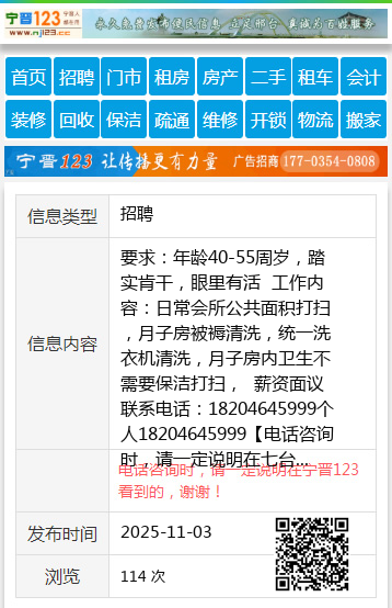 要求:年龄40-55周岁,踏实肯干,眼里有活 工作内容:日常会所公共面积打扫,月子房被褥清洗,统一洗衣机清洗,月子房内卫生不需要保洁打扫, 薪资面议联系电话:18204645999个人18204645999 【电话咨询时,请一定说明在七台河信息网看到的,谢谢!】 |