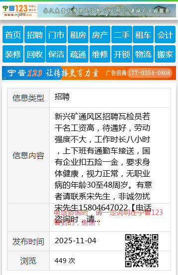 新兴矿通风区招聘瓦检员若干名工资高,待遇好,劳动强度不大,工作时长八小时,上下班有通勤车接送,国有企业扣五险一金,要求身体健康,视力正常,无职业病的年龄30至48周岁。有意者请联系宋先生,非诚勿扰宋先生15804647022 【电话咨询时,请一定说明在七台河信息网看到的,谢谢!】 |
