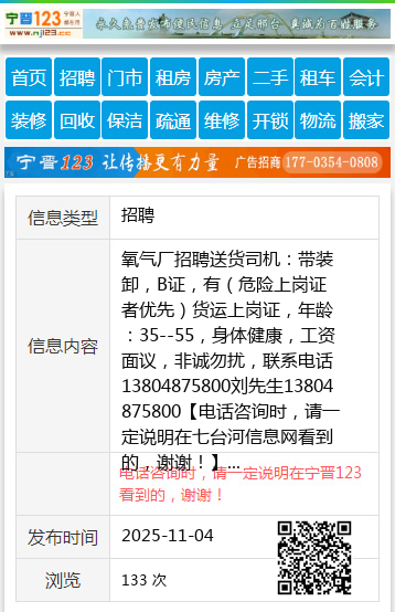 氧气厂招聘送货司机:带装卸,B证,有(危险上岗证者优先)货运上岗证,年龄:35--55,身体健康,工资面议,非诚勿扰,联系电话13804875800刘先生13804875800 【电话咨询时,请一定说明在七台河信息网看到的,谢谢!】 |