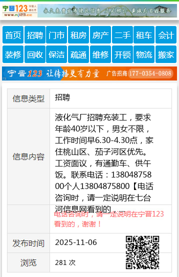 液化气厂招聘充装工,要求年龄40岁以下,男女不限,工作时间早6.30-4.30点,家住桃山区、茄子河区优先。工资面议,有通勤车、供午饭。联系电话:13804875800个人13804875800 【电话咨询时,请一定说明在七台河信息网看到的,谢谢!】 |