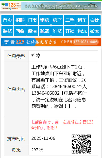 工作时间早6点到下午2点,工作地点山下兴建矿附近,有通勤车辆,工资面议,联系电话:13846466002个人13846466002 【电话咨询时,请一定说明在七台河信息网看到的,谢谢!】 |