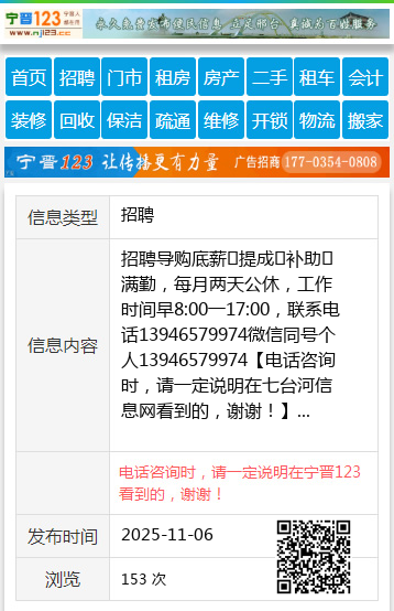 招聘导购底薪➕提成➕补助➕满勤,每月两天公休,工作时间早8:00一17:00,联系电话13946579974微信同号个人13946579974 【电话咨询时,请一定说明在七台河信息网看到的,谢谢!】 |