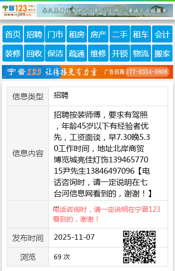 招聘按装师傅,要求有驾照,年龄45岁以下有经验者优先,工资面谈,早7.30晚5.30工作时间,地址北岸商贸博览城亮佳灯饰13946577015尹先生13846497096 【电话咨询时,请一定说明在七台河信息网看到的,谢谢!】 |