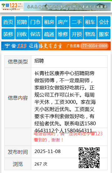 长青社区康养中心招聘厨房做饭师傅,不一定是厨师,家庭妇女做饭好吃就行。正规公司工作可以长干。每周半天休,工资3000。家在海天小区附近优先。工资面义 要求干净利索做饭好吃,有经验者优先。联系电话15804643112个人15804643112 【电话咨询时,请一定说明在七台河信息网看到的,谢谢!】 |