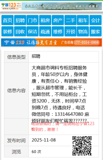 大商超市调料专柜招聘服务员,年龄50岁以内,身体健康,有责任心,有销售经验,服从超市管理,能长干,短期勿扰,不用站柜台,工资3200,无休,时间早7点到晚7点,待遇良好,电话微信同号:13314647080 麻烦好朋友们帮忙转发????????个人13314647080 【电话咨询时,请一定说明在七台河信息网看到的,谢谢!】 |
