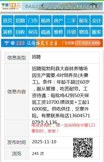 招聘现勃利县大森林养殖场因生产需要.4对饲养员(夫妻工)。条件:年龄不超过60岁,服从管理,吃苦耐劳。工资待遇:每批鸡42到50天保底工资10700.绩效奖+工龄16000奖。供吃供住,交意外险。有意联系电话13604571079个人13604571079 【电话咨询时,请一定说明在七台河信息网看到的,谢谢!】 |