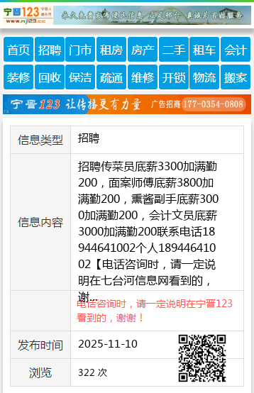 招聘传菜员底薪3300加满勤200,面案师傅底薪3800加满勤200,熏酱副手底薪3000加满勤200,会计文员底薪3000加满勤200联系电话18944641002个人18944641002 【电话咨询时,请一定说明在七台河信息网看到的,谢谢!】 |
