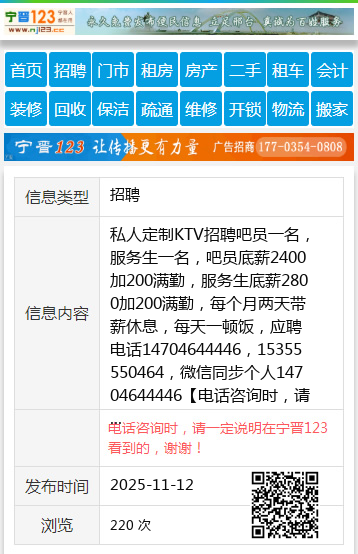 私人定制KTV招聘吧员一名,服务生一名,吧员底薪2400加200满勤,服务生底薪2800加200满勤,每个月两天带薪休息,每天一顿饭,应聘电话14704644446,15355550464,微信同步个人14704644446 【电话咨询时,请一定说明在七台河信息网看到的,谢谢!】 |