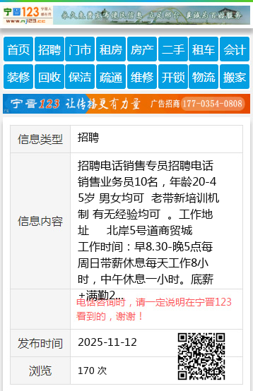 招聘电话销售专员招聘电话销售业务员10名,年龄20-45岁 男女均可 老带新培训机制 有无经验均可 。工作地址 北岸5号道商贸城 工作时间:早8.30-晚5点每周日带薪休息每天工作8小时,中午休息一小时。底薪+满勤2800 普通员工综合工资7000 精英员工8-12000 ,不要想着拿底薪 公司没有拿底薪的员工 公司员工70➕ 目前精英单王 工资15000 薪资真实无水分 只要你努力,必须有回报。地址:七台河桃山区多伦多联系人:崔先生联系方式:18904645551个人18904645551 【电话咨询时,请一定说明在七台河信息网看到的,谢谢!】 |