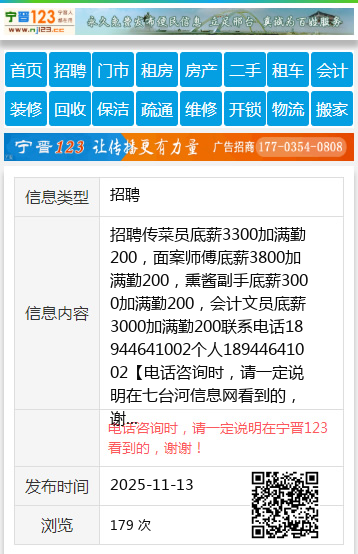 招聘传菜员底薪3300加满勤200,面案师傅底薪3800加满勤200,熏酱副手底薪3000加满勤200,会计文员底薪3000加满勤200联系电话18944641002个人18944641002 【电话咨询时,请一定说明在七台河信息网看到的,谢谢!】 |