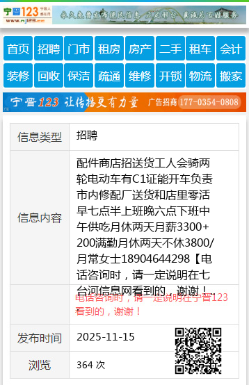 配件商店招送货工人会骑两轮电动车有C1证能开车负责市内修配厂送货和店里零活早七点半上班晚六点下班中午供吃月休两天月薪3300+200满勤月休两天不休3800/月常女士18904644298 【电话咨询时,请一定说明在七台河信息网看到的,谢谢!】 |