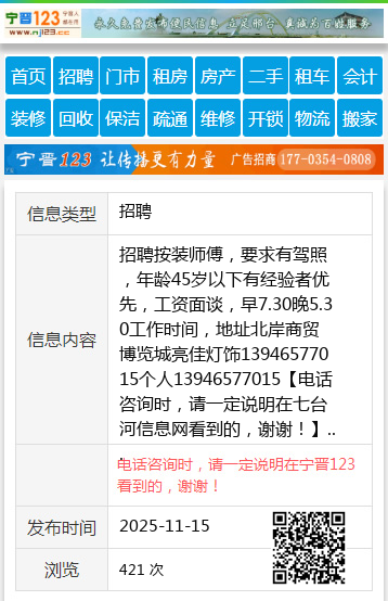 招聘按装师傅,要求有驾照,年龄45岁以下有经验者优先,工资面谈,早7.30晚5.30工作时间,地址北岸商贸博览城亮佳灯饰13946577015个人13946577015 【电话咨询时,请一定说明在七台河信息网看到的,谢谢!】 |