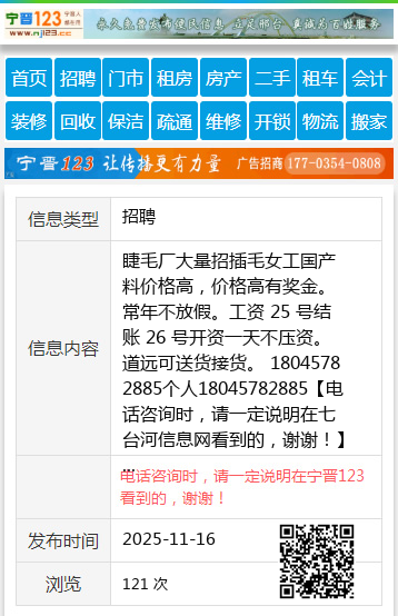 睫毛厂大量招插毛女工国产料价格高,价格高有奖金。常年不放假。工资 25 号结账 26 号开资一天不压资。道远可送货接货。 18045782885个人18045782885 【电话咨询时,请一定说明在七台河信息网看到的,谢谢!】 |