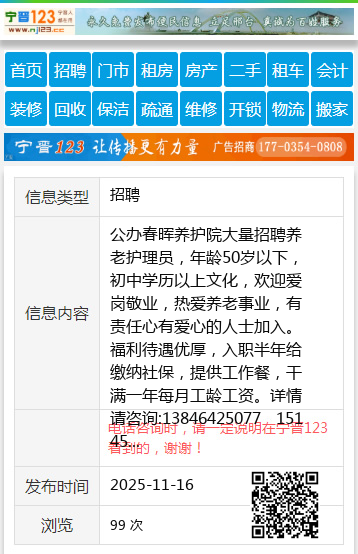 公办春晖养护院大量招聘养老护理员,年龄50岁以下,初中学历以上文化,欢迎爱岗敬业,热爱养老事业,有责任心有爱心的人士加入。福利待遇优厚,入职半年给缴纳社保,提供工作餐,干满一年每月工龄工资。详情请咨询:13846425077 15145652774个人13846425077 【电话咨询时,请一定说明在七台河信息网看到的,谢谢!】 |