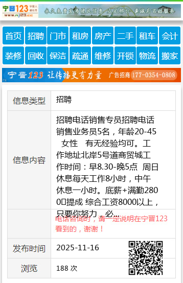 招聘电话销售专员招聘电话销售业务员5名,年龄20-45 女性 有无经验均可。工作地址北岸5号道商贸城工作时间:早8.30-晚5点 周日休息每天工作8小时,中午休息一小时。底薪+满勤2800➕提成 综合工资8000以上,只要你努力,必须有回报。地址:5号道北岸商贸城联系人:崔先生电话:18904645551微信 17745334573个人18904645551 【电话咨询时,请一定说明在七台河信息网看到的,谢谢!】 |