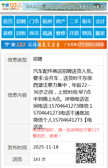 汽车配件商店招聘送货人员。要求:会开车,送货时不东张西望注意力集中,年龄22--36岁之间,上班时间:早7点半到晚上6点。详细电话咨询电话:15704641273微信:15704641273电话不通就加微信个人15704641273 【电话咨询时,请一定说明在七台河信息网看到的,谢谢!】 |